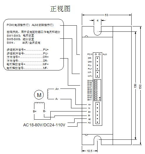 注:可根據客戶要求定制細分數! !注意 1、輸入電壓不能超過AC80V/DC110V; 2、輸入控制信號電平為+5V-+28V范圍,高于+5V時無需外接限流電阻; 3、輸入脈沖信號下降沿有效; 4、驅動器溫度超過80度時驅動器停止工作,故障指示燈ALM亮,直到驅動器溫度降到50度時,驅動器需要重新上電才能恢復工作。出現(xiàn)過熱保護請加裝散熱器; 5、過流(負載短路)故障指示燈ALM亮,請檢查電機接線及其他短路故障,排除后需要重新上電恢復; 6、無電機故障指示燈ALM亮,請檢查電機接線,排除后需要重新上電恢復。 驅動器接線、尺寸示意圖