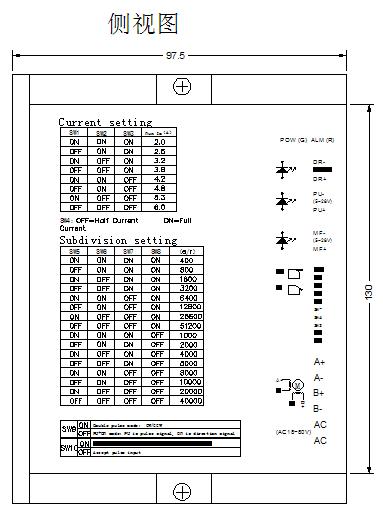 細分數 | 400 | 800 | 1600 | 3200 | 6400 | 12800 | 25600 | 51200 | SW5 | ON | OFF | ON | OFF | ON | OFF | ON | OFF | SW6 | ON | ON | OFF | OFF | ON | ON | OFF | OFF | SW7 | ON | ON | ON | ON | OFF | OFF | OFF | OFF | SW8 | ON | ON | ON | ON | ON | ON | ON | ON | 細分數 | 1000 | 2000 | 4000 | 5000 | 8000 | 10000 | 20000 | 40000 | SW5 | ON | OFF | ON | OFF | ON | OFF | ON | OFF | SW6 | ON | ON | OFF | OFF | ON | ON | OFF | OFF | SW7 | ON | ON | ON | ON | OFF | OFF | OFF | OFF | SW8 | OFF | OFF | OFF | OFF | OFF | OFF | OFF | OFF | SW9 | ON, 雙脈沖:PU為正向步進脈沖信號,DR為反向步進脈沖信號 | OFF, 單脈沖:PU為步進脈沖信號,DR為方向控制信號 | SW10 | 自動檢測開關(OFF時接收外部脈沖,ON時驅動器內部以30轉/分的速度運行) |