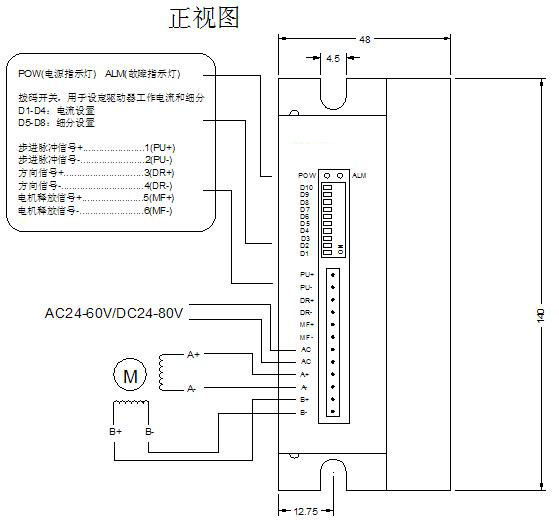注:可根據客戶要求定制細分數! !注意 1、輸入電壓不能超過AC60V/DC80 2、輸入控制信號電平為5V,當高于5V時需要接限流電阻; 3、輸入脈沖信號下降沿有效; 4、驅動器溫度超過80度時驅動器停止工作,故障指示燈ALM亮,直到驅動器溫度降到50度時,驅動器需要重新上電才能恢復工作。出現過熱保護請加裝散熱器; 5、過流(負載短路)故障指示燈ALM亮,請檢查電機接線及其他短路故障,排除后需要重新上電恢復; 6、無電機故障指示燈ALM亮,請檢查電機接線,排除后需要重新上電恢復。 驅動器接線、尺寸示意圖